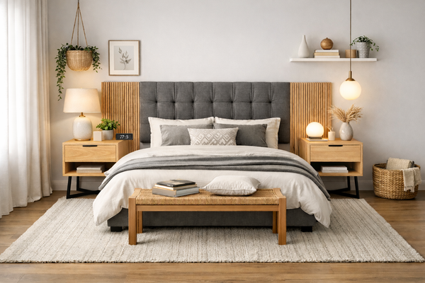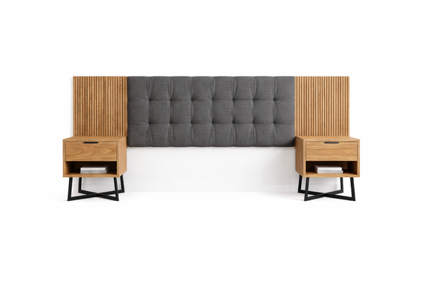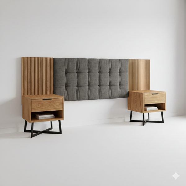 Cabecera Mural: Un panel de 3 metros de largo (la king) que combina un centro acolchado en lino gris (ideal para lectura) con laterales en listonado de madera real que aportan profundidad y estilo contemporáneo.